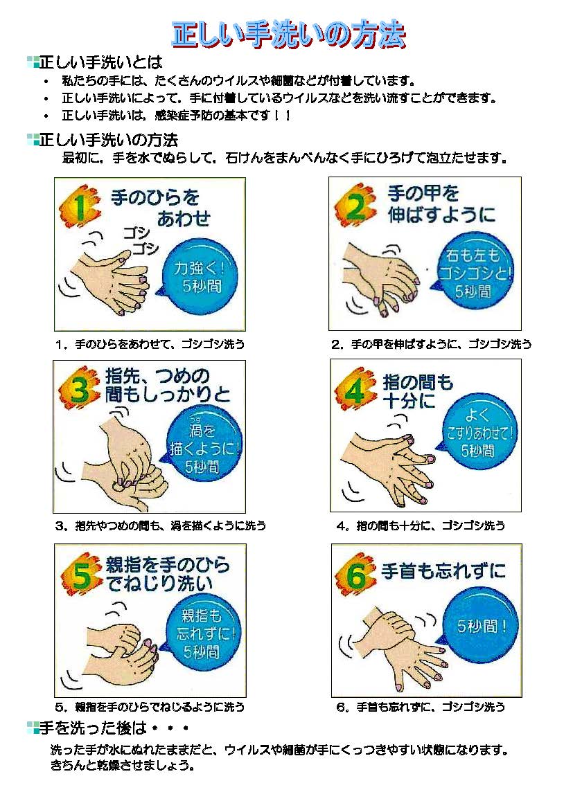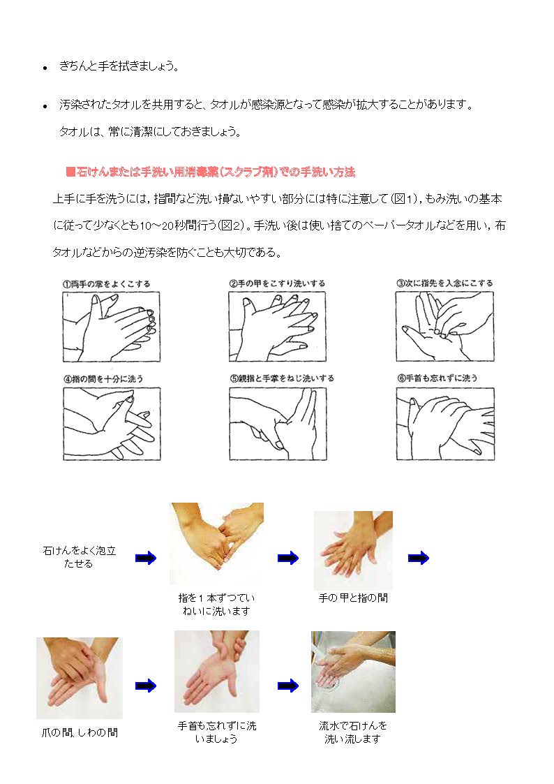 - 手洗いは,ウイルス感染や食中毒の予防の基本です。人が多く集まる場所から帰ってきたときなどには,石鹸で良くもみ洗いし,流水で手洗しましょう。