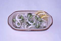 | 材料 | イカ………………………2匹 玉ねぎ……………………2個 きゅうり…………………1本 塩…………………………少々 コショウ…………………少々 サラダ油…………………少々 砂糖………………………適量 酢…………………………適量 |