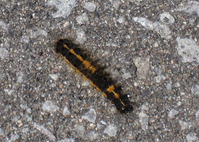 チョウやガの仲間の鱗翅目(りんしもく。チョウ目とも言う。)ドクガ科ドクガ属に属する昆虫です。初期の幼虫は体長1センチ未満で終齢幼虫になると約3.5~4.0センチになります。体色は黒く,脇や背面などに橙色の筋模様があり,白く見える毛が生えています。