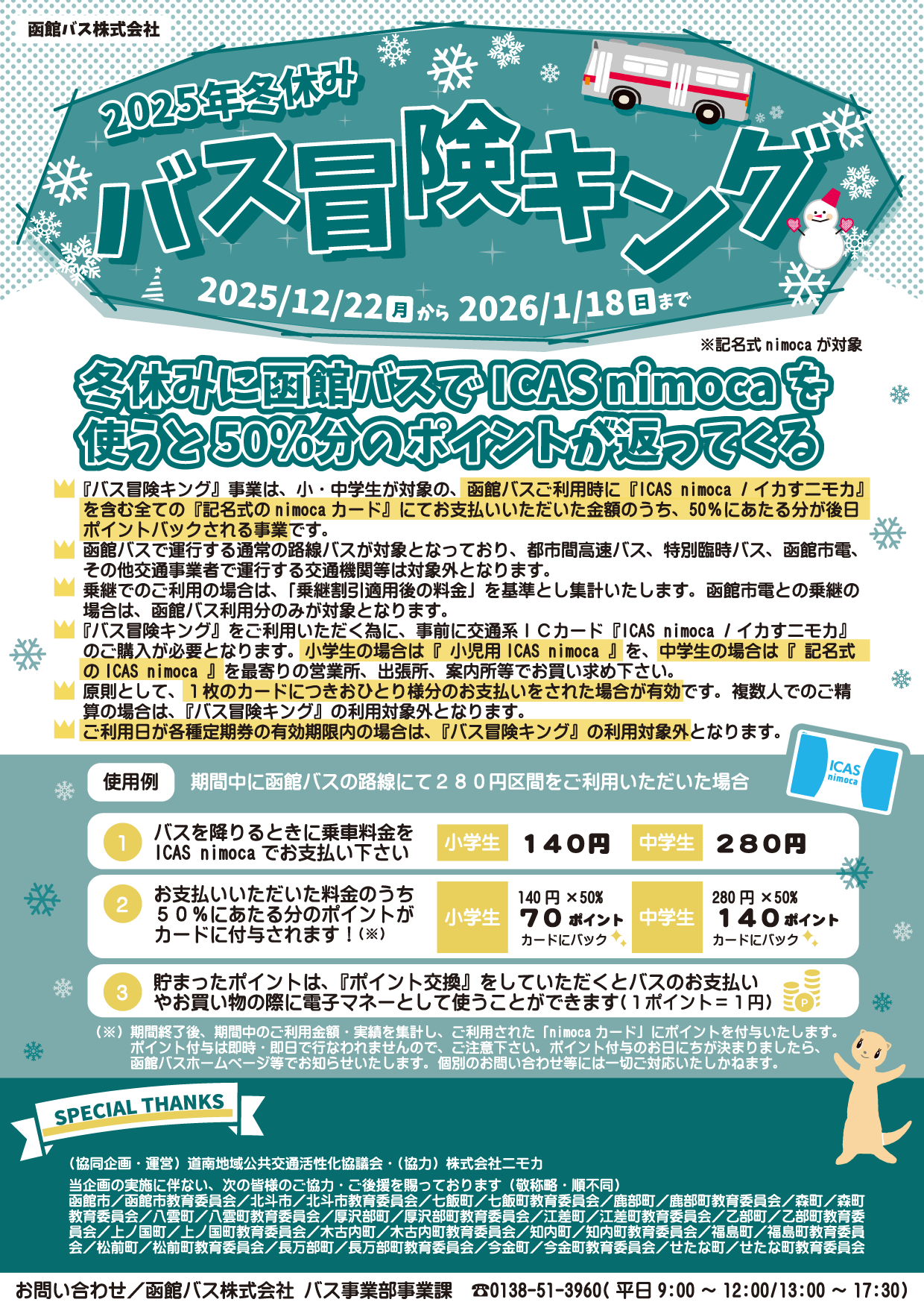 夏休み・冬休み期間中に,函館バス車内で「記名式のICAS nimocaカード」で支払った乗車料金のうち,