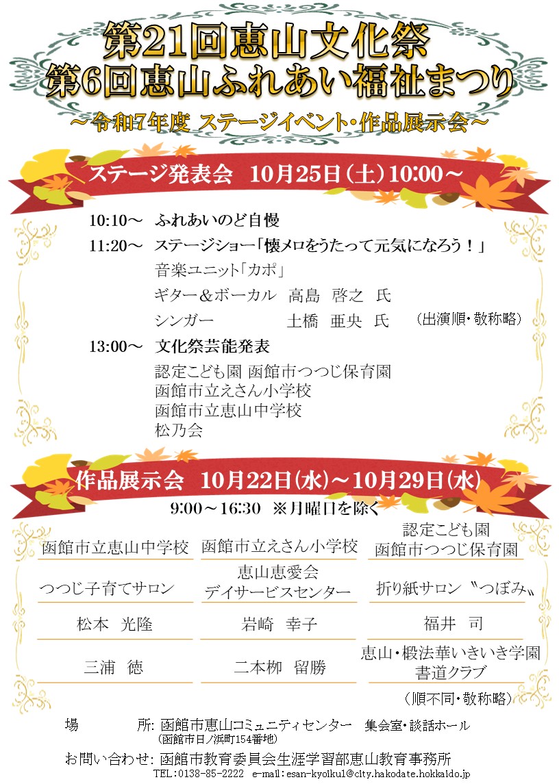 恵山文化祭は,今年で21回目の開催を迎えることとなりました。ご協力いただきました地域の皆さま,各団体の皆さまに深く感謝申し上げますとともに,恵山文化祭が今後も地域の文化芸術活動の場として親しまれ,恵山地域の文化芸術活動がますます発展することを願っています。
