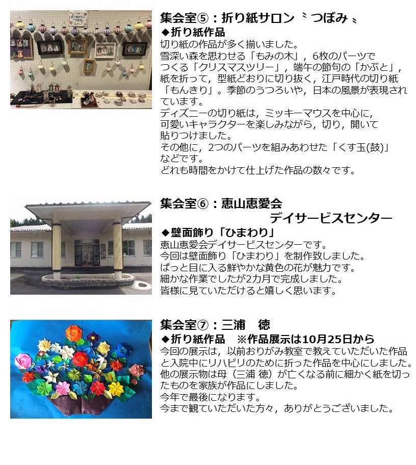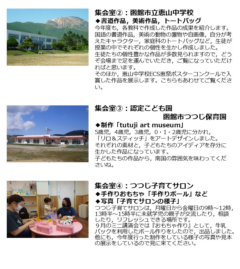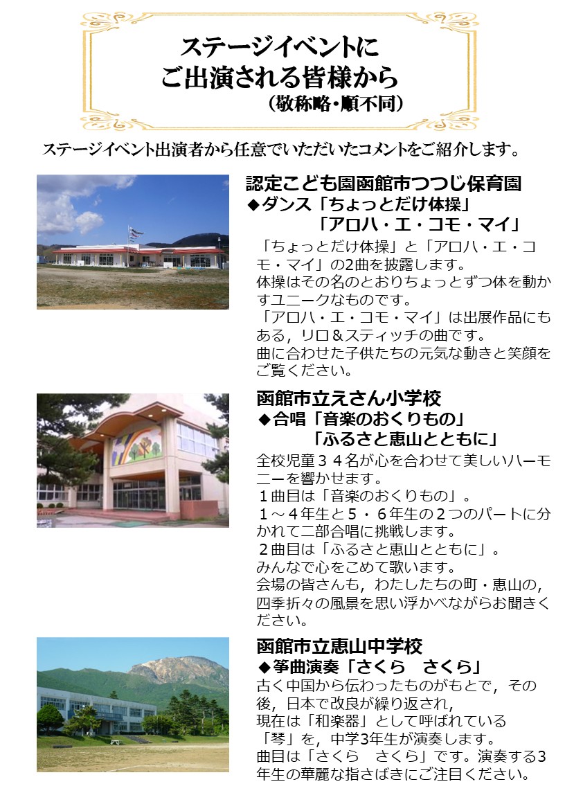 今回は,函館市ボランティア連絡協議会えさんとの共催によりステージイベントを開催するとともに,恵山地域の保育園の園児や小中学校の児童・生徒による絵画,書道や置き物などのほか,地域で文化芸術活動などを行っている方の折り紙,手芸や写真作品を展示しています。