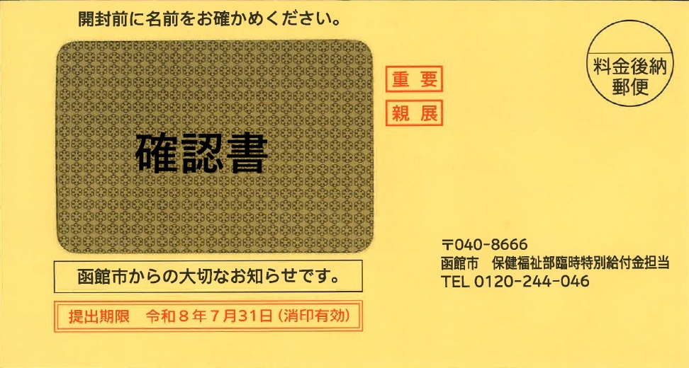 → 令和8年(2026年)4月中旬を目途に,確認書(令和7年1月2日以降に函館市に転入した方がいる世帯等にあたっては申請書)を送付しますので,内容を確認のうえ,申請期限までに確認書(申請書)を返送してください。なお,確認書が届いた世帯については,オンライン申請(確認書および添付書類の返送不要)を行うことも可能です。