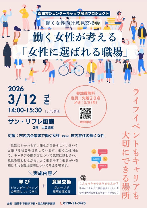 性別にかかわらず自らの個性や能力を存分に発揮できる社会を構築することにより,まちの活力を生み出し,本市の持続的発展につながるよう,職場におけるジェンダーギャップ解消の推進を図るため,働く女性がキャリアや働き方について意見交換を行い,職場の課題や改善のヒントを共有することで,働きやすく働きがいのある職場環境について考えることを目的としています。